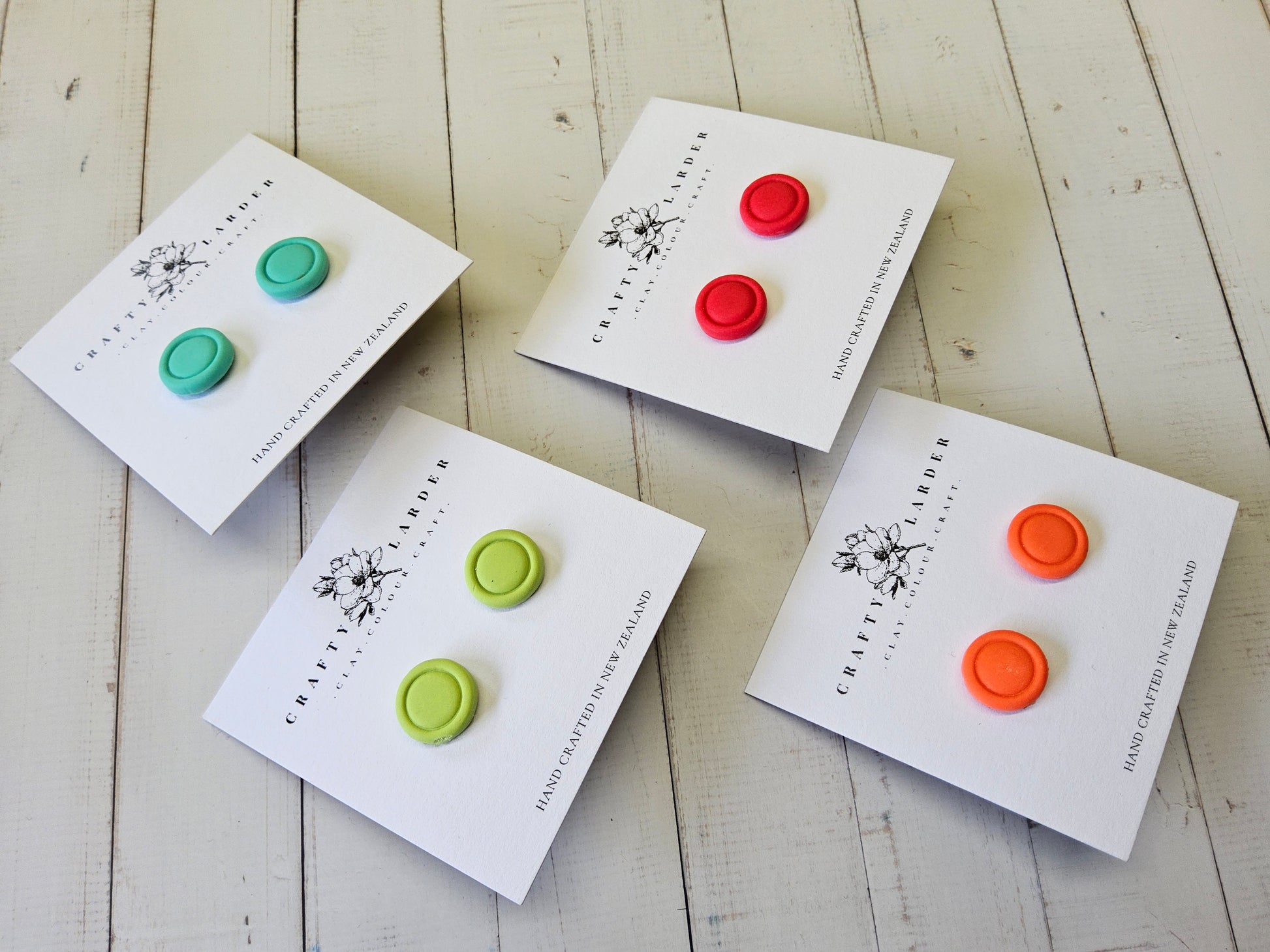 Handmade lightweight studs for little ears, available in bright orange, bright green, raspberry pink, and aqua blue. Finished with hypoallergenic findings, these playful earrings are perfect for adding a pop of fun colour to any outfit. Choose your favourite colour or collect them all!